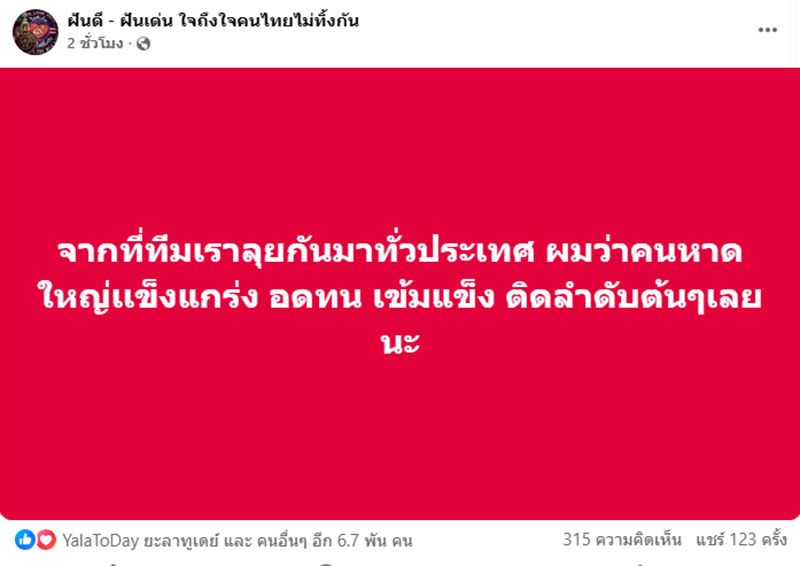วันที่ 2 ธันวาคม 2568 เพจเฟซบุ๊ก "ฝันดี - ฝันเด่น ใจถึงใจคนไทยไม่ทิ้งกัน" โพสต์สเตตัสเฟซบุ๊ก ระบุว่า จากที่ทีมเราลุยกันมาทั่วประเทศ ผมว่าคนหาดใหญ่เเข็งแกร่ง อดทน เข้มแข็ง ติดลำดับต้นๆเลยนะ