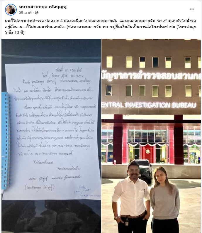 ล่าสุด ทนายสายหยุด เพ็งบุญชู โพสต์เฟซบุ๊กระบุว่า "ผมก็ไม่อยากให้ตำรวจ ปอศ.กก.4 ต้องเหนื่อยไปขอออกหมายค้น..และขอออกหมายจับ..พาเข้ามอบตัวไปนั่งรออยู่ตั้งนาน....ก็ไม่ยอมมารับมอบตัว...(ข้อหาตามหมายจับ พ.ร.ก.กู้ยืมเงินอันเป็นการฉ้อโกงประชาชน (โทษจำคุก 5 ถึง 10 ปี) "