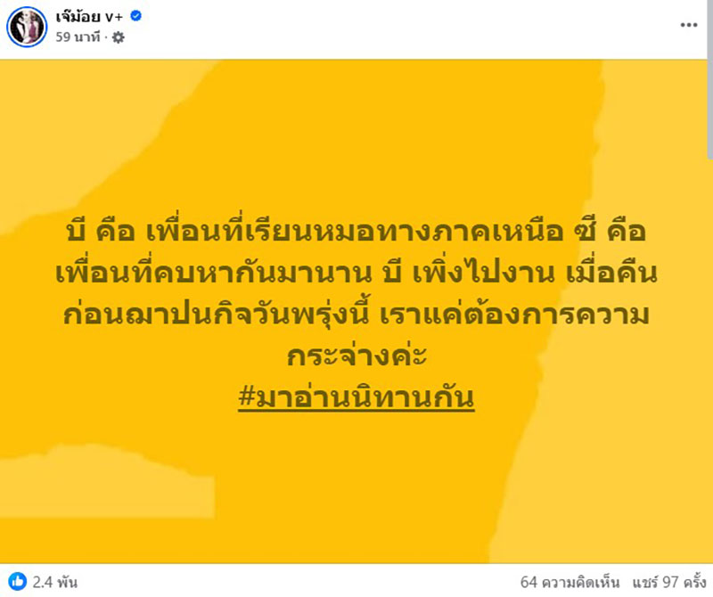 ก่อนที่ เพจ เจาะลึกทั่วไทย Inside Thailand จะโพสต์ ข้อความปริศนาตามลงมาติด ๆ " "ไซยาไนด์" นักข่าว" และเริ่มมีเพจต่าง ๆ โพสต์ตามกันลงมา และที่น่าสนใจอยู่ในตอนนี้ก็คือ บนโลกออนไลน์ได้เพจดังออกมาเล่านิทาน A B,C เป็นนิทานสุดสยองที่เกิดขึ้นกับกลุ่มเพื่อน 3 คน นำมาซึ่งการตายอย่างมีเงื่อนงำของ "เอ" โดยเหตุการณ์ทั้งหมดเกิดขึ้นที่บ้านของผู้ตายเอง ขณะที่คำบอกเล่าของเพื่อนที่อยู่ในเหตุการณ์กลับเต็มไปด้วยช่องโหว่ และมีการกล่าวถึงตัวละคร B ว่าประกอบอาชีพอะไร และ ซี เพื่อนที่เอเพิ่งรู้จัก