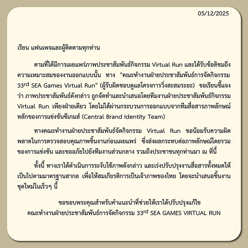 จากกรณีโลกออนไลน์ วิพากษ์วิจารณ์อย่างหนักเกี่ยวกับการออกแบบภาพประชาสัมพันธ์ (Artwork) กิจกรรม "วิ่งสะสมระยะพิชิตเหรียญซีเกมส์ Virtual Run" ซึ่งเป็นส่วนหนึ่งของการแข่งขันกีฬาซีเกมส์ ครั้งที่ 33 หรือ ซีเกมส์ 2025 ที่ประเทศไทยเป็นเจ้าภาพ