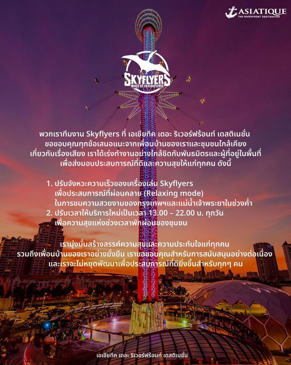 ล่าสุดทางเพจบุ๊กเพจ Asiatique The Riverfront Destination ที่มีผุ้ติดตาม 3.7 แสนรายบนเฟซบุ๊กได้ออกมาร่อนจดหมายแถลง ระบุว่า พวกเราทีมงาน Skyflyers ที่ เอเชียทีค เดอะ ริเวอร์ฟร้อนท์ เดสติเนชั่น ขอขอบคุณทุกข้อเสนอแนะจากเพื่อนบ้านของเราและชุมชนใกล้เคียงเกี่ยวกับเรื่องเสียง เราได้เร่งทำงานอย่างใกล้ชิดกับพันธมิตรและผู้ที่อยู่ในพื้นที่เพื่อส่งมอบประสบการณ์ที่ดีและความสุขให้แก่ทุกคน ดังนี้