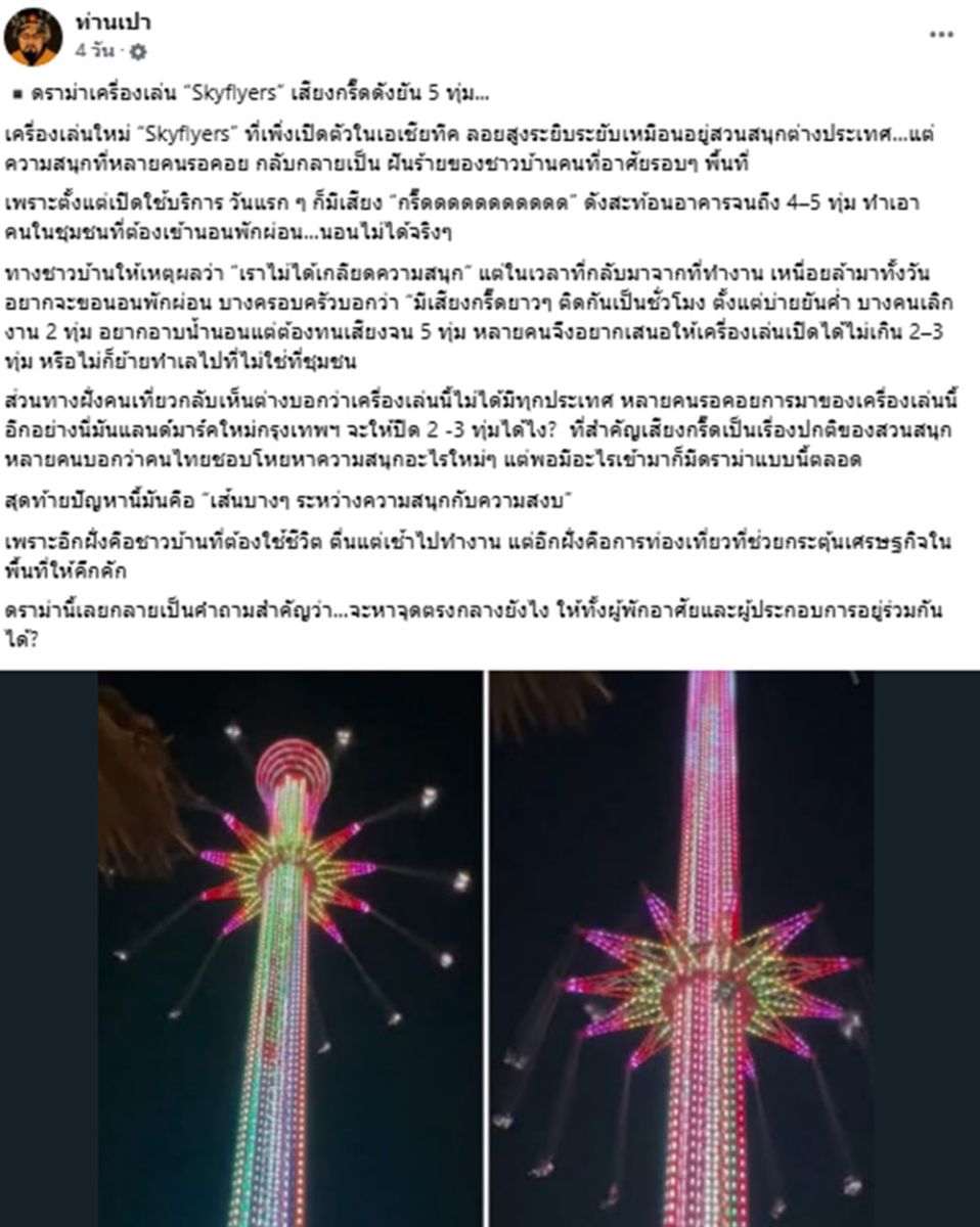 ต่อมาทางเพจเฟซบุ๊ก ท่านเปา เผยว่า เครื่องเล่นใหม่ Skyflyers ที่เพิ่งเปิดตัวในเอเชียทีค ลอยสูงระยิบระยับเหมือนอยู่สวนสนุกต่างประเทศ…แต่ความสนุกที่หลายคนรอคอย กลับกลายเป็น ฝันร้ายของชาวบ้านคนที่อาศัยรอบๆ พื้นที่ เพราะตั้งแต่เปิดใช้บริการ วันแรก ๆ ก็มีเสียง กรี๊ดดดดดดดดดดด ดังสะท้อนอาคารจนถึง 4–5 ทุ่ม ทำเอาคนในชุมชนที่ต้องเข้านอนพักผ่อน…นอนไม่ได้จริงๆ