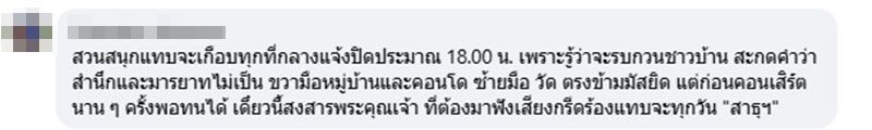 ทางชาวบ้านให้เหตุผลว่า เราไม่ได้เกลียดความสนุก แต่ในเวลาที่กลับมาจากที่ทำงาน เหนื่อยล้ามาทั้งวัน อยากจะขอนอนพักผ่อน บางครอบครัวบอกว่า มีเสียงกรี๊ดยาวๆ ติดกันเป็นชั่วโมง ตั้งแต่บ่ายยันค่ำ บางคนเลิกงาน 2 ทุ่ม อยากอาบน้ำนอนแต่ต้องทนเสียงจน 5 ทุ่ม หลายคนจึงอยากเสนอให้เครื่องเล่นเปิดได้ไม่เกิน 2–3 ทุ่ม หรือไม่ก็ย้ายทำเลไปที่ไม่ใช่ที่ชุมชน