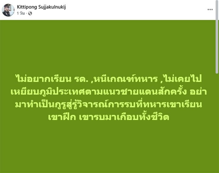 เมื่อวันที่ 10 ธันวาคม 2568 พ.อ.กิตติพงษ์ สัจจกุลนุกิจ ผู้อำนวยการกองจัดการเคลื่อนย้าย ศูนย์การเคลื่อนย้าย กองทัพบก โพสต์ข้อความผ่านเฟซบุ๊ก Kittipong Sujjakulnukij ระบุว่า "ไม่อยากเรียน รด. ,หนีเกณฑ์ทหาร ,ไม่เคยไปเหยียบภูมิประเทศตามแนวชายแดนสักครั้ง อย่ามาทำเป็นกูรูสู่รู้วิจารณ์การรบที่ทหารเขาเรียน เขาฝึก เขารบมาเกือบทั้งชีวิต"