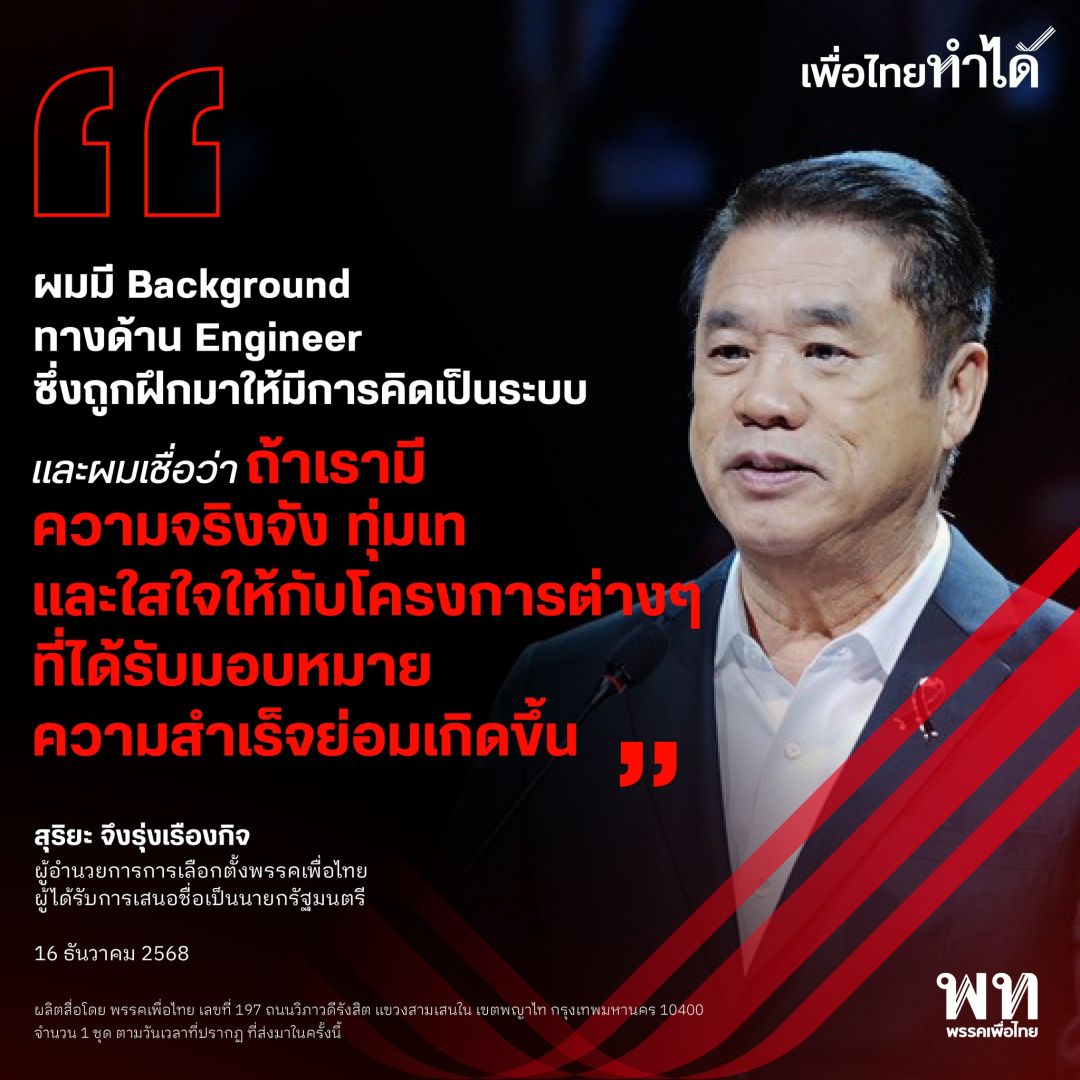 เมื่อวันที่ 16 ธ.ค.2568 จากกรณีที่พรรคเพื่อไทย ได้เปิดตัวแคนดิเดตนายกรัฐมนตรีของพรรค โดยประกอบด้วย 1. ศาสตราจารย์ ดร.ยศชนัน วงศ์สวัสดิ์ 2.นายจุลพันธ์ อมรวิวัฒน์ หัวหน้าพรรค และ 3.นายสุริยะ จึงรุ่งเรืองกิจ ผู้อำนวยการเลือกตั้งพรรคเพื่อไทย โดยหน้าเพจเฟซบุ๊กพรรคเพื่อไทย ได้โพสต์ภาพแคนดิเดตนายกฯ ทั้ง 3 คน พร้อมโควทคำพูดแสดงวิสัยทัศน์ในงาน “ยกเครืองประเทศไทย เพือไทยทําได้”