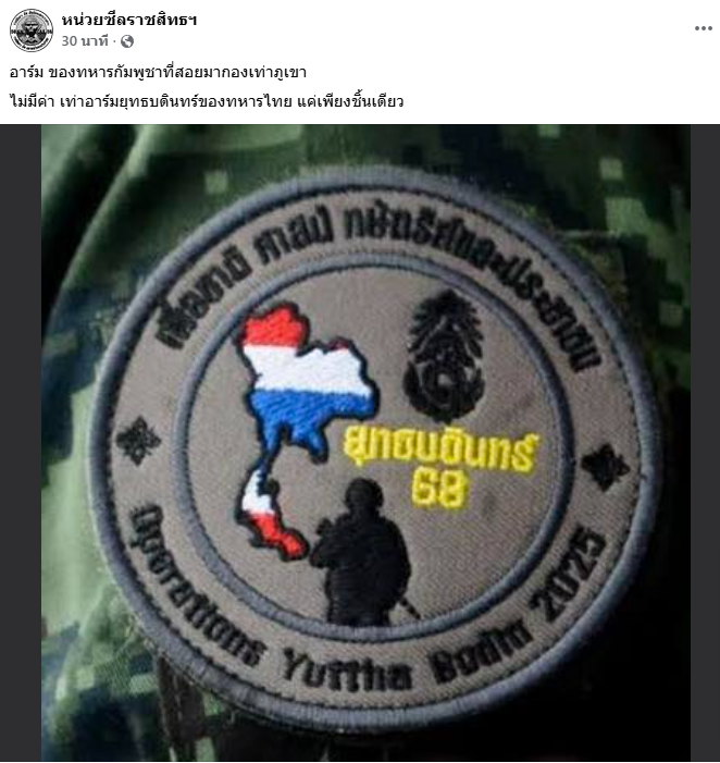 17 ธ.ค. 68 เพจเฟซบุ๊ก หน่วยซีลราชสิทธฯ โพสต์อาร์มของทหารไทย พร้อมระบุว่า อาร์ม ของทหารกัมพูชาที่สอยมากองเท่าภูเขา ไม่มีค่าเท่า อาร์มยุทธบดินทร์ของทหารไทย แค่เพียงชิ้นเดียว