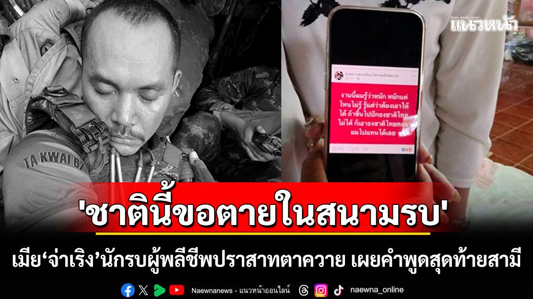 เปิดใจเมีย"จ่าเริง" นักรบผู้พลีชีพปราสาทตาควาย! เผยคำพูดสุดท้าย "ชาตินี้ขอตายในสนามรบ" พี่สาวช็อกร่างหายไร้ร่องรอย หลังปะทะเดือดเขมร
