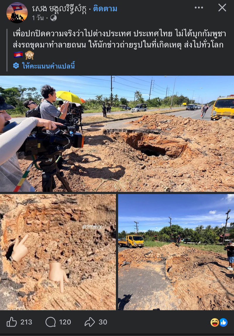 18 ธันวาคม 2568 สื่อสังคมออนไลน์ประเทศกัมพูชา โพสต์ภาพร่องรอยการทำลายกระสุนปืนใหญ่ 122 มิลลิเมตรที่หน่วยเฉพาะกิจนาวิกโยธินตราดเข้าเก็บกู้และทำลายเมื่อวันที่ 16 ธันวาคม 2568 ที่ผ่านมา พร้อมแคปชั่นระบุว่า กัมพูชาไม่ได้ยิงกระสุนปืนใหญ่ใส่ฝั่งไทย แต่ทหารนาวิกโยธินได้ใช้แม็คโครขุดทำลายถนนให้เป็นหลุมกว้าง แล้วเรียกนักข่าวมาทำข่าวกล่าวว่าประเทศกัมพูชาเป็นผู้ยิงใส่ฝั่งไทย โดยบางภาพวงเล็บรอยขุดที่รถแบคโฮ ยืนยันว่าทหารไทยขุดถนนเองไม่ได้มาจากกระสุนตก