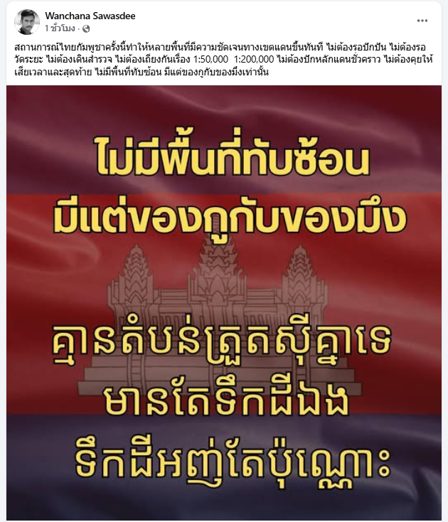 และยังบอกด้วยว่า " สถานการณ์ไทยกัมพูชาครั้งนี้ทำให้หลายพื้นที่มีความชัดเจนทางเขตแดนขึ้นทันที ไม่ต้องรอปักปัน ไม่ต้องรอวัดระยะ ไม่ต้องเดินสำรวจ ไม่ต้องเถียงกันเรื่อง 1:50,000 1:200,000 ไม่ต้องปักหลักแดนชั่วคราว ไม่ต้องคุยให้เสียเวลาและสุดท้าย ไม่มีพื้นที่ทับซ้อน มีแต่ของกูกับของมึงเท่านั้น "