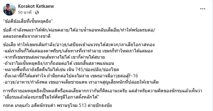1 มกราคม 2569 กรกต เกตุแก้ว อดีตนักรบดำ พรานจู่โจม 513 ค่ายปักธงชัย อดีตนักรบเดนตายหลายสมรภูมิ โพสต์ข้อความผ่านเฟซบุ๊ก Korakot Ketkaew หัวข้อ “ข้อดีข้อเสียที่เซ็นหยุดยิง” ระบุว่า...