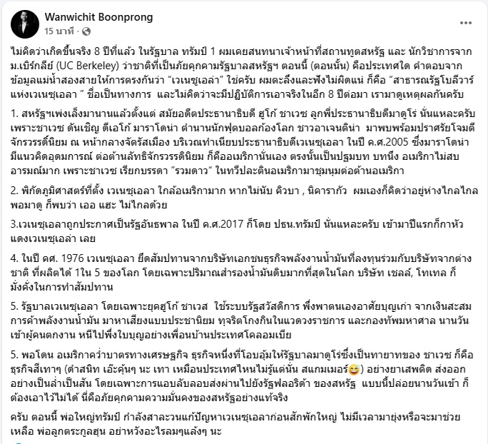 ไม่คิดว่าเกิดขึ้นจริง 8 ปีที่แล้ว ในรัฐบาล ทรัมป์ 1 ผมเคยสนทนาเจ้าหน้าที่สถานทูตสหรัฐ และ นักวิชาการจาก ม.เบิร์กลีย์ (UC Berkeley) ว่าชาติที่เป็นภัยคุกคามรัฐบาลสหรัฐฯ ตอนนี้ (ตอนนั้น) คือประเทศใด คำตอบจากข้อมูลแม่น้ำสองสายให้การตรงกันว่า “เวเนซูเอล่า” ใช่ครับ ผมตะลึงและฟังไม่ผิดแน่ ก็คือ “สาธารณรัฐโบลีวาร์แห่งเวเนซุเอลา ” ชื่อเป็นทางการ และไม่คิดว่าจะมีปฏิบัติการเอาจริงในอีก 8 ปีต่อมา เรามาดูเหตุผลกันครับ