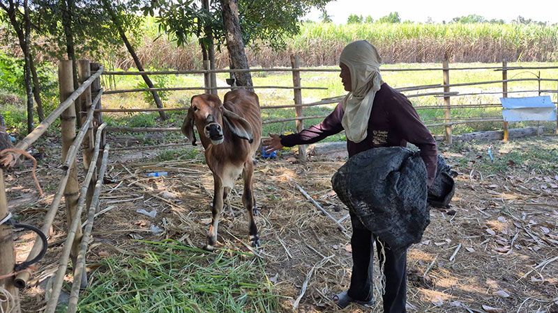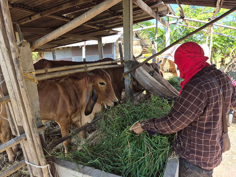 นายศรายุทธ ดุนแสง อายุ 53 ปี ชาวบ้าน ต.จันทบเพชร อ.บ้านกรวด จ.บุรีรัมย์ บอกว่า ตั้งแต่เกิดสถานการณ์ชายแดนก็ต้องล่ามวัว ทั้ง 5 ตัว ขังไว้ในคอก และได้แต่ฝากให้ ชรบ.และตนเองแวะเวียนมาเป็นครั้งคราว เพื่อเอาหญ้าแห้งให้วัวกิน ก็เพิ่งช่วงนี้แหละที่ได้กลับเข้ามาบ้านได้ออกหาตัดหญ้าสดมาให้วัวกิน ซึ่งก่อหน้านี้ที่เกิดเหตุการณ์วัวก็ได้มาล้มตายลง 1 ตัว เพราะตกใจเสียงปืนใหญ่และวิ่งชนกันตาย ก็ได้ให้ชาวบ้านนำไปชำแหละแบ่งกันกินในช่วงนั้น ซึ่งก็ไม่ได้แจ้งให้ทางผู้นำชุมชนทราบ เพราะไม่รู้ว่าจะต้องแจ้งหรือไม่อย่างไร
