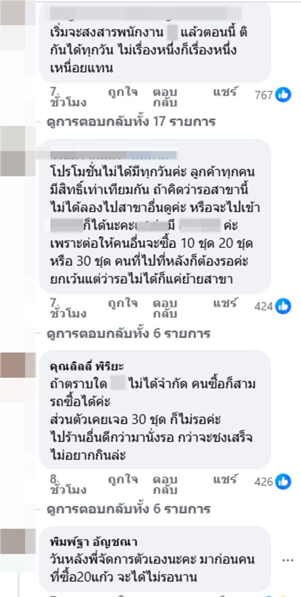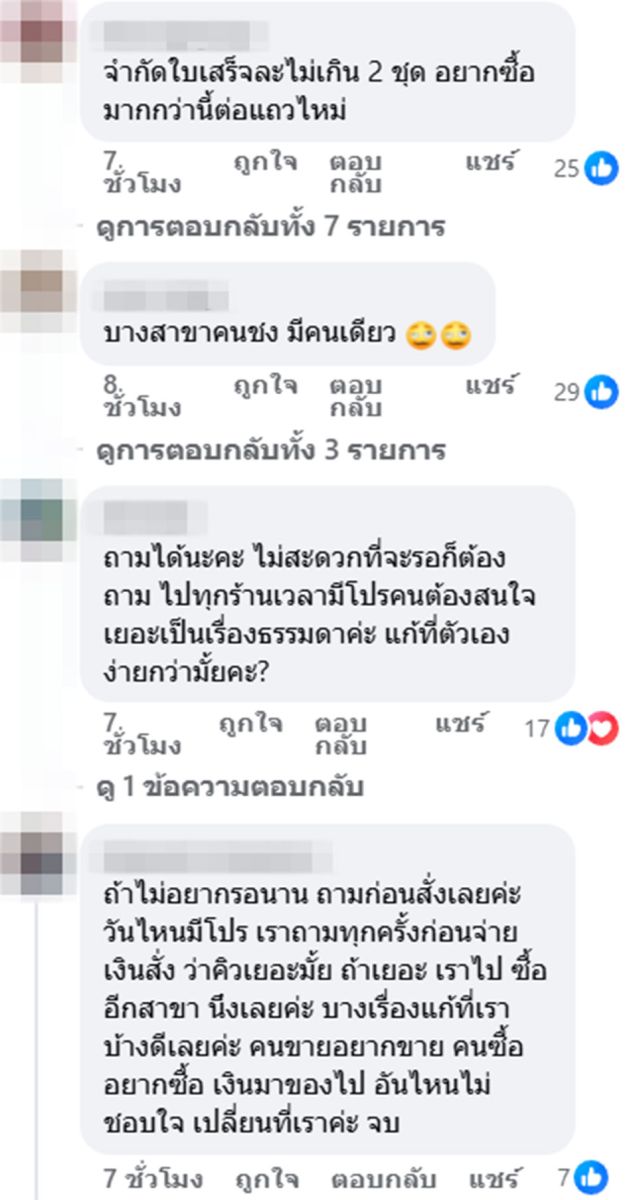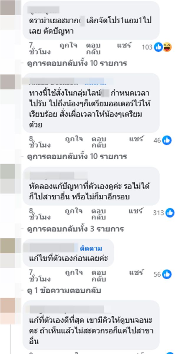 ขณะที่อีกหลายคอมเมนต์ยังเสนอแนะว่าทางร้านค้าควรพิจารณาจำกัดจำนวนชุดต่อใบเสร็จในช่วงเวลาเร่งด่วน หรือแยกเคาน์เตอร์สำหรับออเดอร์จำนวนมาก ทั้งยังฝากถึงพนักงาน ควรแจ้งระยะเวลารอคิวให้ลูกค้าท่านต่อไปทราบทันที เพื่อให้ลูกค้าตัดสินใจได้ว่าจะรอหรือเปลี่ยนใจ และสำหรับลูกค้า หากต้องการสั่งจำนวนมาก แนะนำให้ใช้การสั่งผ่านแอปฯ ล่วงหน้า หรือเลือกสาขาที่มีพนักงานเพียงพอ