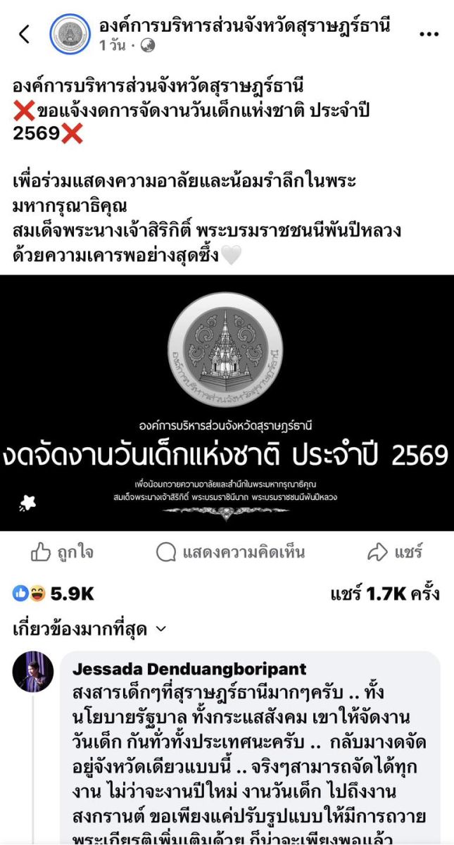 ย้อนกลับไปก่อนหน้านี้ เพจเฟซบุ๊กของ อบจ.สุราษฎร์ธานี ได้โพสต์ข้อความแจ้ง "งดจัดงานวันเด็ก" โดยให้เหตุผลว่าเพื่อร่วมแสดงความอาลัย ซึ่งสร้างความสงสัยให้กับประชาชนในพื้นที่เป็นอย่างมาก เนื่องจากหน่วยงานภาครัฐและเอกชนอื่นๆ ทั่วประเทศยังคงจัดกิจกรรมเพื่อมอบความสุขให้เด็กๆ ตามปกติ ทำให้เกิดกระแส "ทัวร์ลง" และตั้งคำถามถึงความเหมาะสมของการนำเหตุผลดังกล่าวมาใช้ยกเลิกงานของเด็กๆ