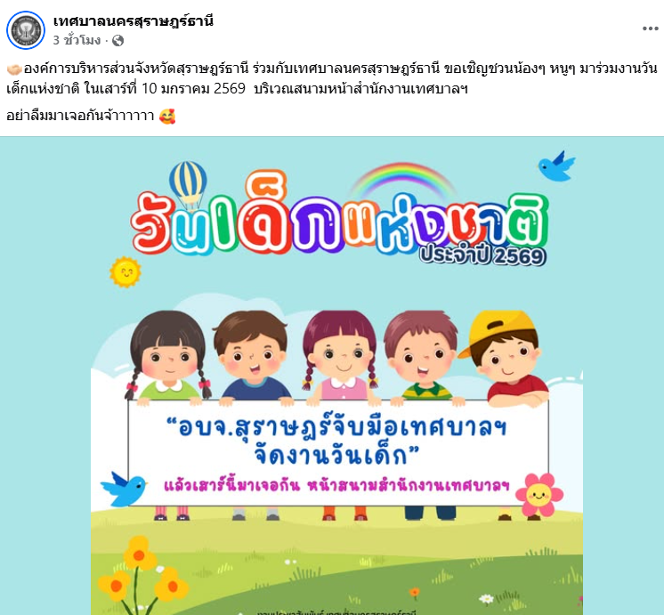"องค์การบริหารส่วนจังหวัดสุราษฎร์ธานี ร่วมกับ เทศบาลนครสุราษฎร์ธานี ขอเชิญชวนน้องๆ หนูๆ มาร่วมงานวันเด็กแห่งชาติ ในวันเสาร์ที่ 10 มกราคม 2569 บริเวณสนามหน้าสำนักงานเทศบาลฯ อย่าลืมมาเจอกันจ้าาาาาา"