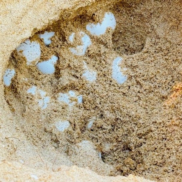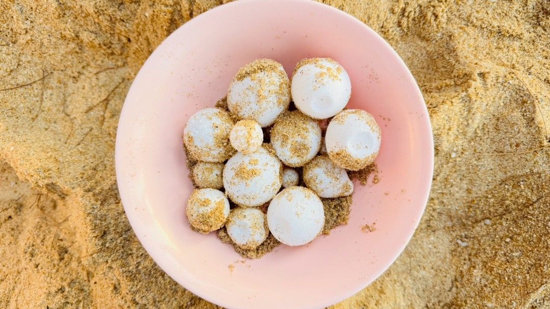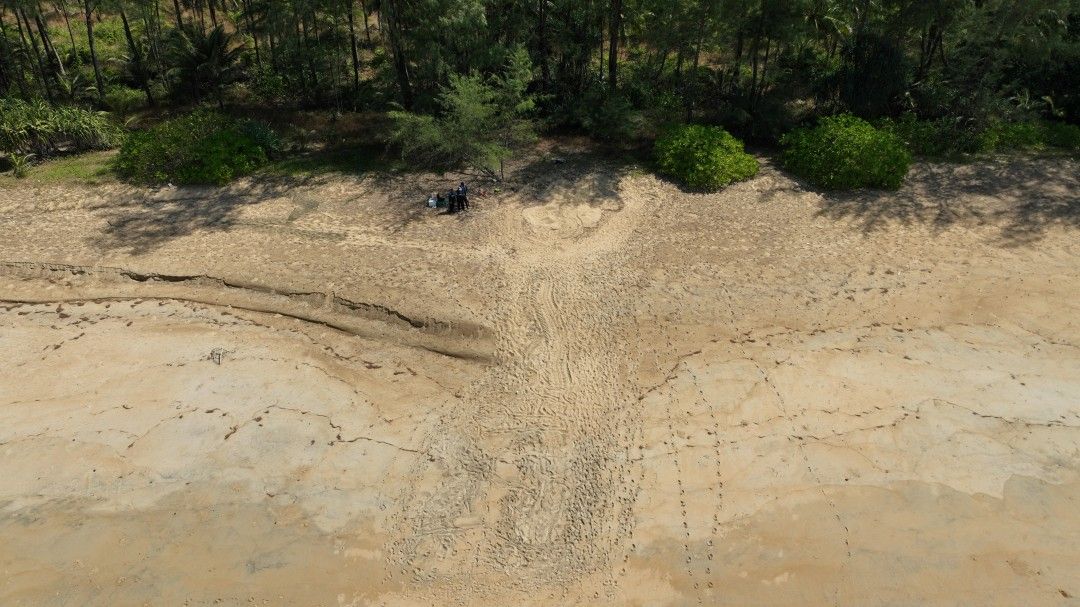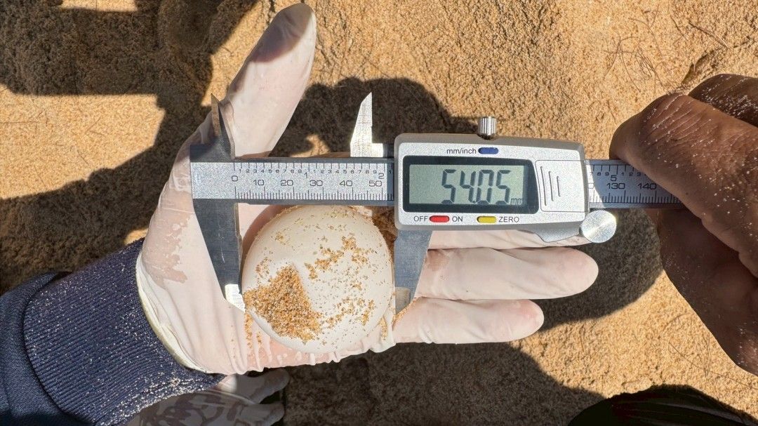 จากการตรวจสอบพื้นที่ชายหาด พบร่องรอยของ ‘เต่ามะเฟือง’ ซึ่งเป็นสัตว์ทะเลหายาก โดยวัดขนาดรอยพายคู่หน้ามีความกว้างถึง 160 ซม. และขนาดอกกว้าง 70 ซม. สะท้อนถึงขนาดตัวของแม่พันธุ์ที่สมบูรณ์ เจ้าหน้าที่ได้ทำการขุดค้นหาจนพบไข่เต่าที่ระดับความลึก 30 ซม. รวมทั้งสิ้น 105 ฟอง แบ่งเป็นไข่ดี 74 ฟอง และไข่ลม 31 ฟอง