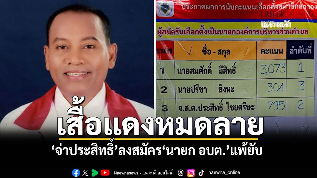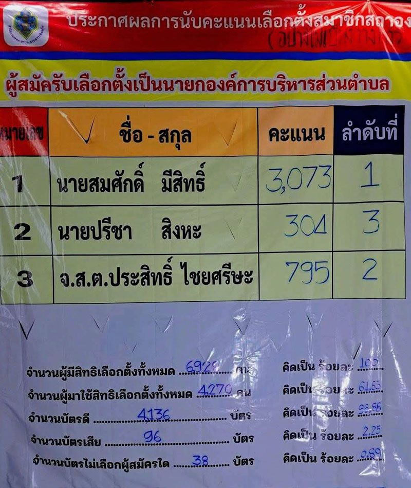 ผลปรากฏว่า จ.ส.ตประสิทธิ์ ไชยศรีษะ แพ้เลือกตั้งนายก อบต. ได้คะแนนเพียง 795 เท่านั้น โดยผู้ชนะเลือกตั้งกวาดผลคะแนนไปทั้งหมด 3,073 คะแนน