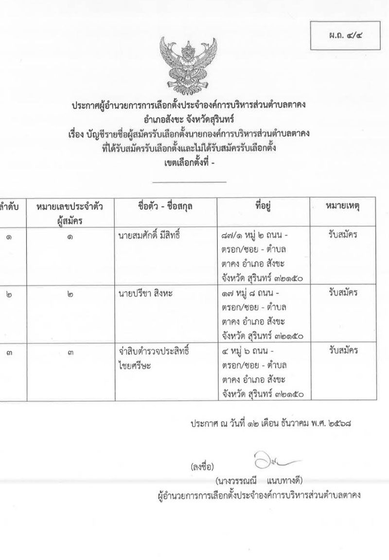 ล่าสุดได้ลงสมัครนายกองค์การบริหารส่วนตำบลตาดง อำเภอสังขะ จังหวัดสุรินทร์ ซึ่งในเขตพื้นที่นี้มีผู้สมัครจำนวน 3 ราย