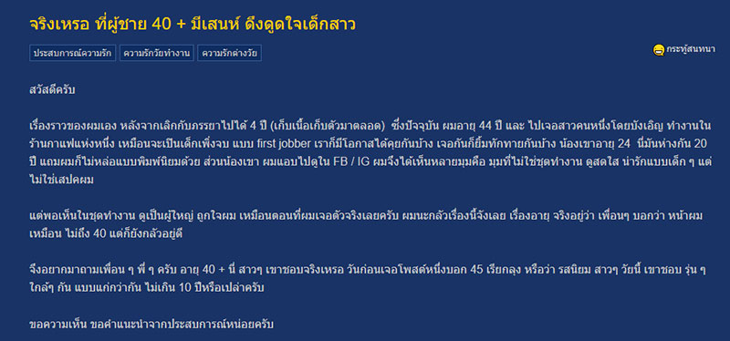 โดยเจ้าของกระทู้ได้โพสต์ ถึงเรื่องราวนี้ว่า สวัสดีครับ เรื่องราวของผมเอง หลังจากเลิกกับภรรยาไปได้ 4 ปี (เก็บเนื้อเก็บตัวมาตลอด) ซึ่งปัจจุบัน ผมอายุ 44 ปี และ ไปเจอสาวคนหนึ่งโดยบังเอิญ ทำงานในร้านกาแฟแห่งหนึ่ง เหมือนจะเป็นเด็กเพิ่งจบ แบบ first jobber เราก็มีโอกาสได้คุยกันบ้าง เจอกันก็ยิ้มทักทายกันบ้าง น้องเขาอายุ 24 นี่มันห่างกัน 20 ปี แถมผมก็ไม่หล่อแบบพิมพ์นิยมด้วย ส่วนน้องเขา ผมแอบไปดูใน FB / IG ผมจึงได้เห็นหลายมุมคือ มุมที่ไม่ใช่ชุดทำงาน ดูสดใส น่ารักแบบเด็ก ๆ แต่ไม่ใช่เสปคผม