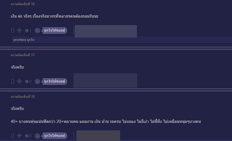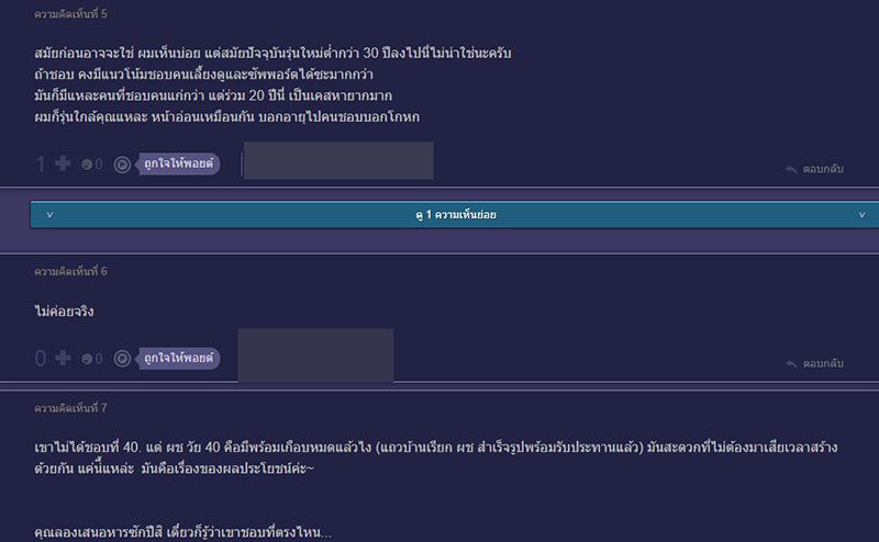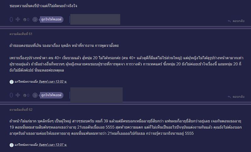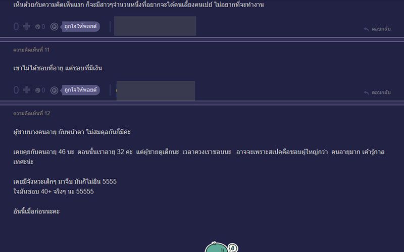 สำหรับคำแนะนำนั้นส่วนใหญ่มองว่า น่าจะถูกใจ และมีความอบอุ่นแนวผู้ใหญ่ , สมัยก่อนอาจจะใช่ ผมเห็นบ่อย แต่สมัยปัจจุบันรุ่นใหม่ต่ำกว่า 30 ปีลงไปนี่ไม่น่าใช่นะครับ ถ้าชอบ คงมีแนวโน้มชอบคนเลี้ยงดูและซัพพอร์ตได้ซะมากกว่า มันก็มีแหละคนที่ชอบคนแก่กว่า แต่ร่วม 20 ปีนี่ เป็นเคสหายากมาก ผมก็รุ่นใกล้คุณแหละ หน้าอ่อนเหมือนกัน บอกอายุไปคนชอบบอกโกหก ,ตอนเรา20ชอบ ผช มีอายุหน่อย เทคแคร์ดี ใส่ใจ ใจเย็น เป็นผู้ใหญ่อบอุ่น ให้คำแนะนำ ปรึกษาได้ดี ,เห็นด้วยกับความคิดเห็นแรก ก็จะมีสาวๆจำนวนหนึ่งที่อยากจะได้คนเลี้ยงคนเปย์ ไม่อยากที่จะทำงาน , เงิน ค่ะ จริงๆ เรื่องจริงมากๆที่หลายๆคนต้องยอมรับนะ ,40+ บางคนหุ่นแน่นฟิตกว่า 20+หลายคน แถมงาน เงิน บ้าน รถครบ ไม่งอแง ไม่งี่เง่า ไม่ขี้หึง ไม่เหมือนหนุ่มๆบางคน