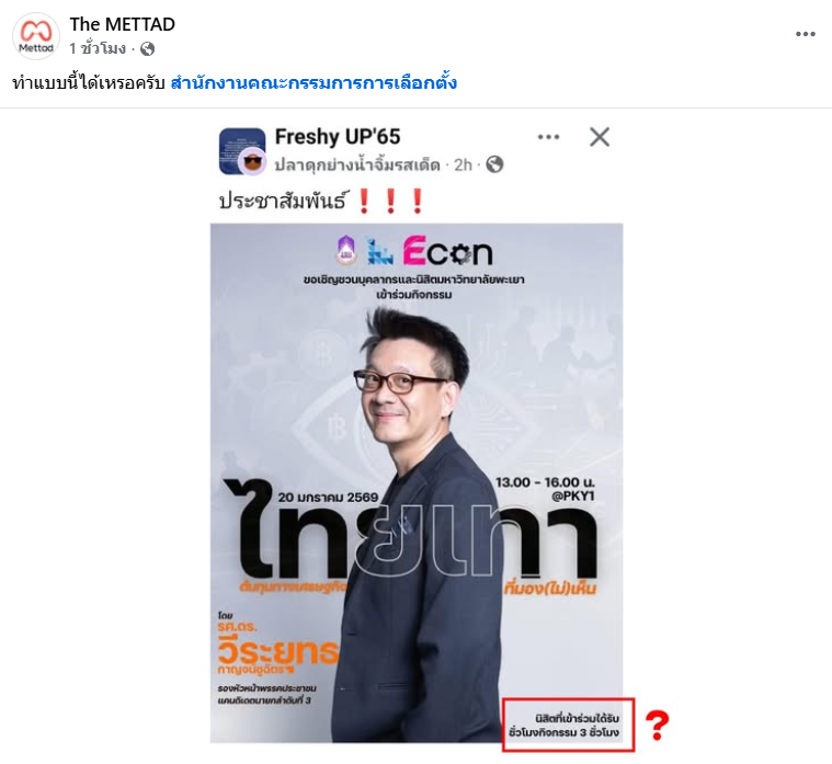 ขณะที่เพจเฟซบุ๊กชื่อดังอย่าง The METTAD ได้แชร์โพสต์ดังกล่าวพร้อมตั้งคำถามว่า "ทำแบบนี้ได้เหรอครับ" พร้อมแท็กไปยังสำนักงานคณะกรรมการการเลือกตั้ง (กกต.) เพื่อขอคำชี้แจง เนื่องจากกังวลว่าการใช้สิทธิประโยชน์ทางการศึกษามาจูงใจนิสิตอาจเข้าข่ายความผิดตามกฎหมายเลือกตั้ง