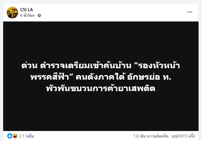 เมื่อวันที่ 21 มกราคม 2569 เพจเฟซบุ๊ก "CSI LA" โพสต์ข้อความระบุว่า "ด่วน ตำรวจเตรียมเข้าค้นบ้าน “รองหัวหน้าพรรคสีฟ้า” คนดังภาคใต้ อักษรย่อ ท. พัวพันขบวนการค้ายาเสพติด" พร้อมยังโพสต์ในคอมเมนต์อีกว่า "ตำรวจออกหมายค้นแล้ว"