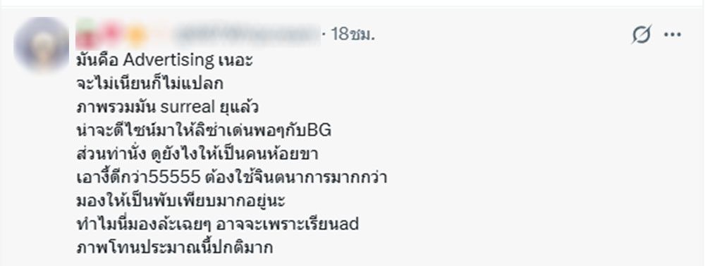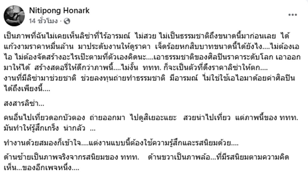 ด้าน ดี้ นิติพงษ์ ห่อนาค ได้ออกมาโพสต์ในเฟซบุ๊กส่วนตัว "Nitipong Honark" ระบุข้อความว่า "เป็นภาพที่ฉันไม่เคยเห็นลิซ่าที่ไร้อารมณ์ ไม่สวย ไม่เป็นธรรมชาติถึงขนาดนี้มาก่อนเลย ได้แก้วงามราคาหมื่นล้าน มาประดับงานให้ดูราคา เจ็ดร้อยหกสิบบาทขนาดนี้ได้ยังไง….ไม่ต้องเอไอ ไม่ต้องจัดสร้างอะไรเป๊ะตามที่ตัวเองคิดนะ….เอาธรรมชาติของศิลปินราคาระดับโลก เอาออกมาให้ได้ สร้างสตอรี่ให้ดีกว่าภาพนี้….ไม่งั้น ททท. ก็จะเป็นตัวที่ดึงราคาลิซ่าให้ตก….งานที่มีลิซ่ามาช่วยชาติ ช่วยลงทุนถ่ายทำธรรมชาติ มีอารมณ์ ไ่ม่ใช่ใช้เอไอมาด้อยค่าศิลปินได้ถึงเพียงนี้….