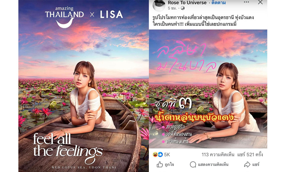 ต่อมาทาง การท่องเที่ยวแห่งประเทศไทย (ททท.) ได้ปล่อยภาพแคมเปญ "ลิซ่าที่ทะเลบัวแดง" พร้อมระบุเนื้อหาว่า สัมผัสความสงบที่ทะเลบัวแดง จังหวัดอุดรธานี ปล่อยใจไปกับผืนน้ำสีชมพูที่เต็มไปด้วยดอกบัวบานสะพรั่งในแสงแรกของวัน ช่วงเวลาที่ทุกอย่างรอบตัวจะหมุนช้าลง จนหัวใจของคุณรับรู้ได้ถึงความรู้สึกอิ่มเอมและได้พักผ่อนอย่างแท้จริง สัมผัสถึงทุกความรู้สึกที่เมืองไทย Feel all the Feelings