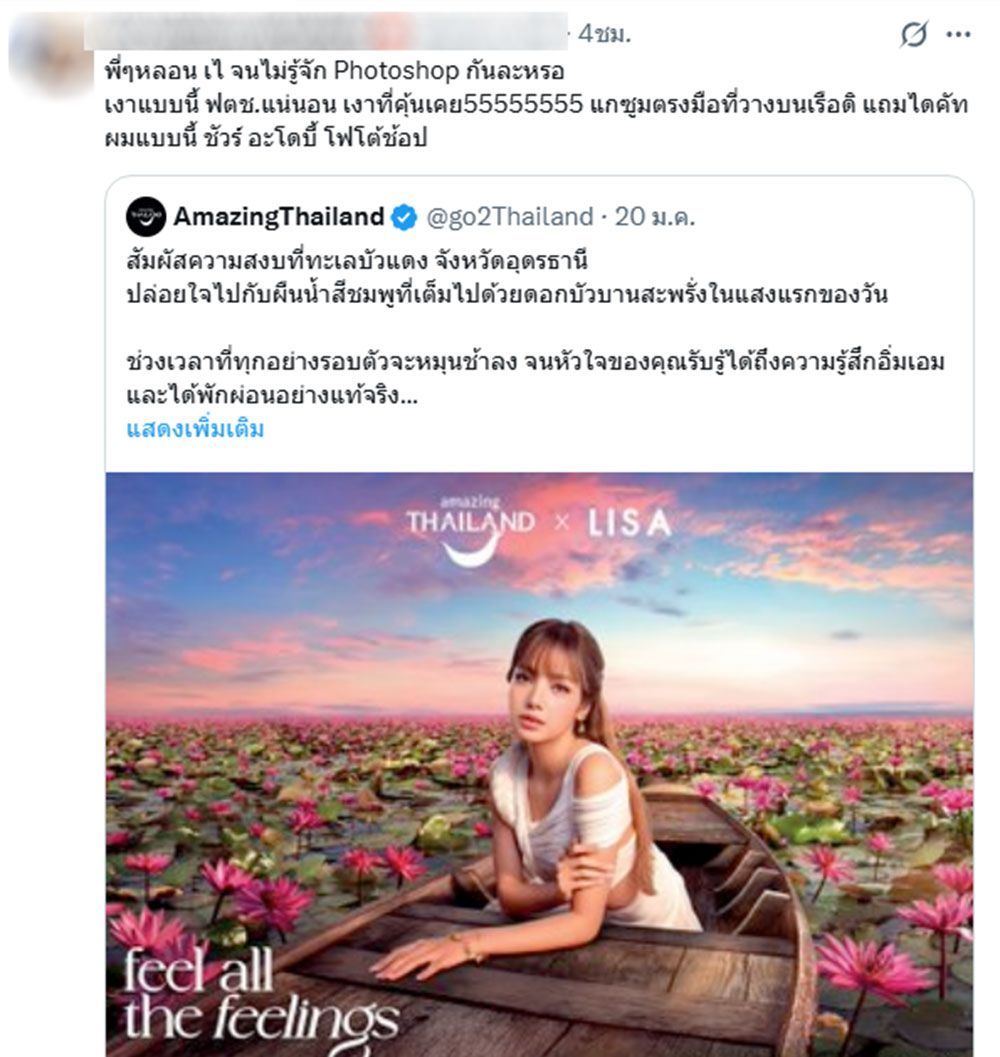 ซึ่งหลังจากที่ ททท. ได้ปล่อยภาพนี้ออกไปนั้น ชาวเน็ตได้เสียงแตกออกไปเป็น 2 เสียงทันที เพราะมีด้านที่ชื่นชมความสวยงามของทะเลบัวแดงพร้อมทั้งความสวยของ ลิซ่า ลลิษา แต่กระแสอีกด้านก็ดุเดือด เพราะประเด็นโฆษณาชุดนี้ที่ใช้ AI ทำออกมาแบบไม่สมจริง พร้อมทั้งบอกอีกด้วยว่าตัวของ ลิซ่า นั้นดูลอยๆ ไม่กลมกลืนไปกับธรรมชาติ อีกทั้งยังเสียดายที่ทาง ททท. ได้ศิลปินระดับโลกมาเป็น Ambassador แล้ว ควรจะไปถ่ายที่สถานที่จริงมากกว่าใช้ภาพตัดต่อ