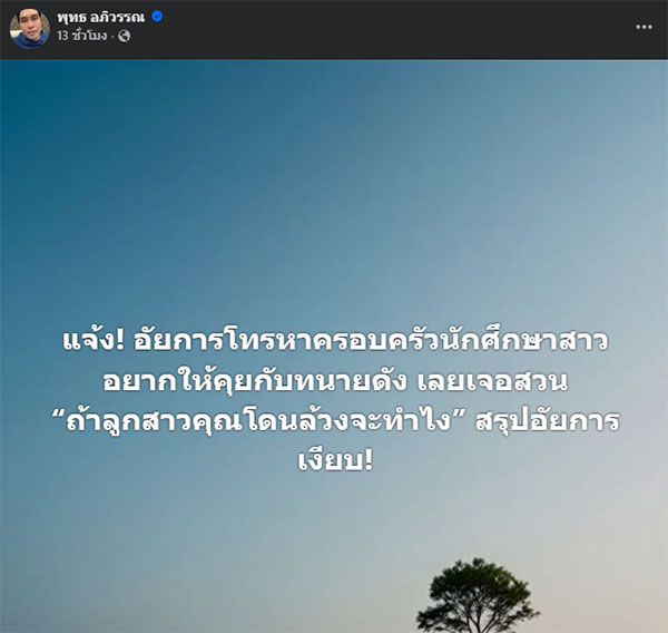 ต่อมา “พุทธ อภิวรรณ” ผู้ประกาศข่าวชื่อดัง ได้โพสต์ข้อความผ่านเฟซบุ๊ก ระบุว่า "แจ้ง! อัยการโทรหาครอบครัวนักศึกษาสาว อยากให้คุยกับทนายดัง เลยเจอสวน “ถ้าลูกสาวคุณโดนล้วงจะทำไง” สรุปอัยการ เงียบ!"