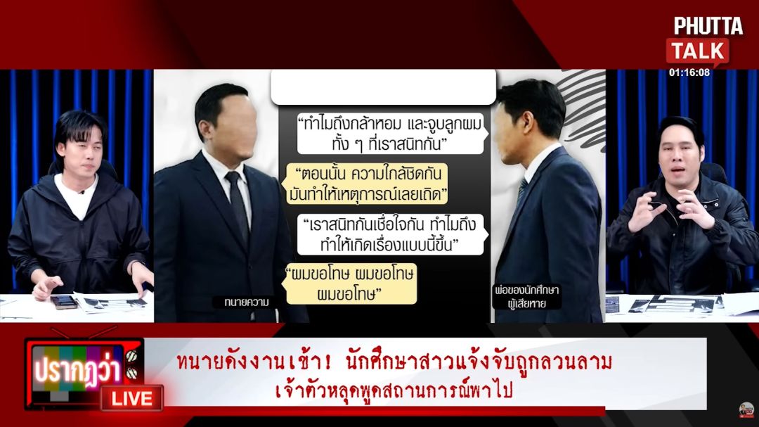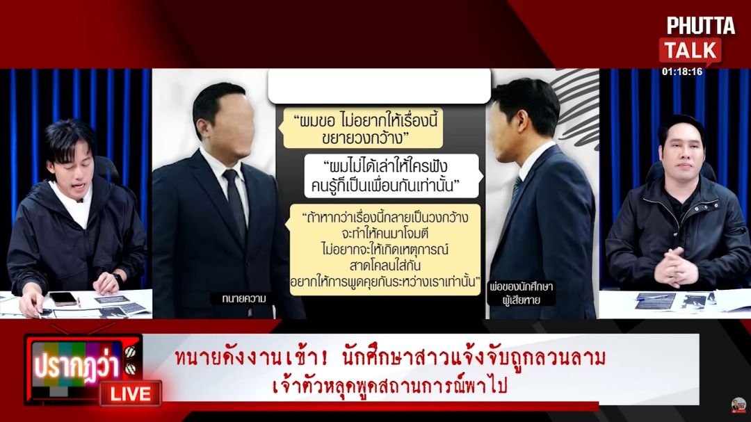 และในรายการ ปรากฏว่า live ของ พุทธ อภิวรรณ ได้เปิดเผยแชตข้อความระหว่างทนายความกับพ่อของนักศึกษาผู้เสียหาย ซึ่งมีเนื้อหาว่า