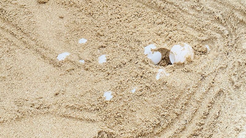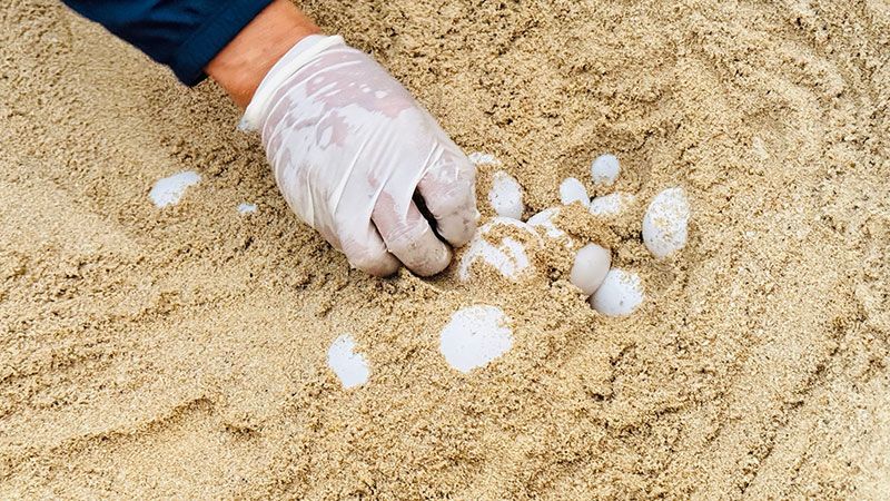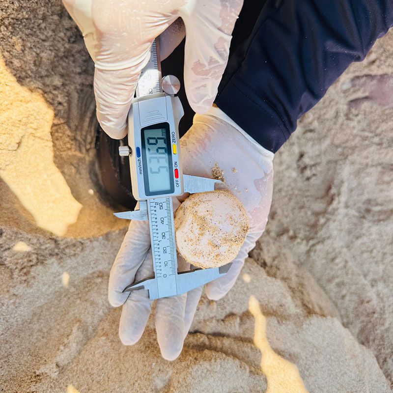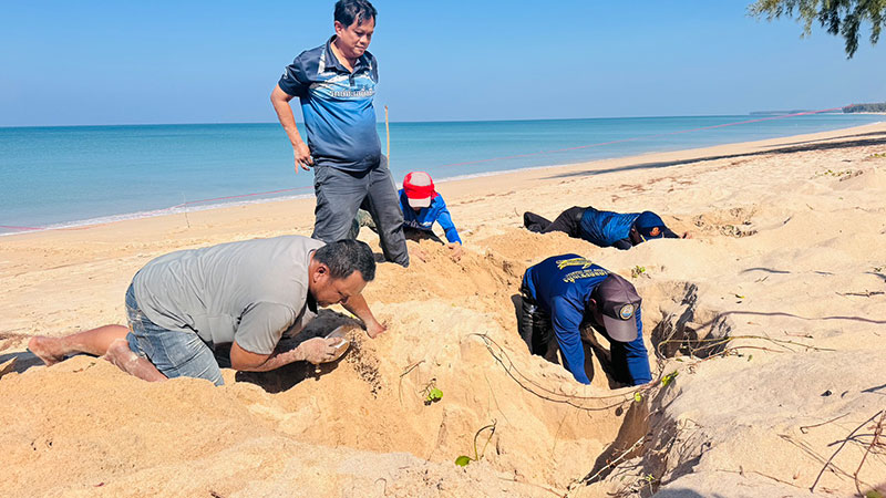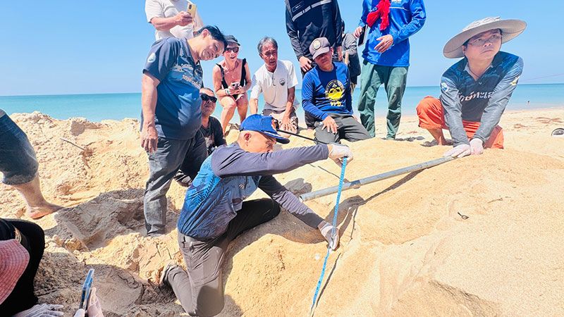 วัดขนาดพายคู่หน้า 160 ซม. ขนาดอกกว้าง 65 ซม.จากนั้นได้ร่วมกันค้นหาจนพบรังและตรวจสอบพบว่าเป็นจุดที่น้ำทะเลขึ้นถึง จึงได้ทำการขุดเอาไข่ขึ้นมานับได้ 91 ฟอง เป็นไข่ดี 84 ฟอง ไข่ลม 6 ฟอง และไข่แตกในรัง 1 ฟอง ก่อนทำการย้ายไปฝังในรังใหม่ในที่น้ำทะเลหนุนไม่ถึง พร้อมทำการกั้นพื้นที่ เพื่อควบคุมดูแลความปลอดภัย พร้อมติดตั้งป้ายแจ้งเตือน ห้ามประชาชนและนักท่องเที่ยวเข้าใกล้ เพื่อป้องกันการรบกวนและเพิ่มโอกาสในการฟักเป็นตัวของลูกเต่า