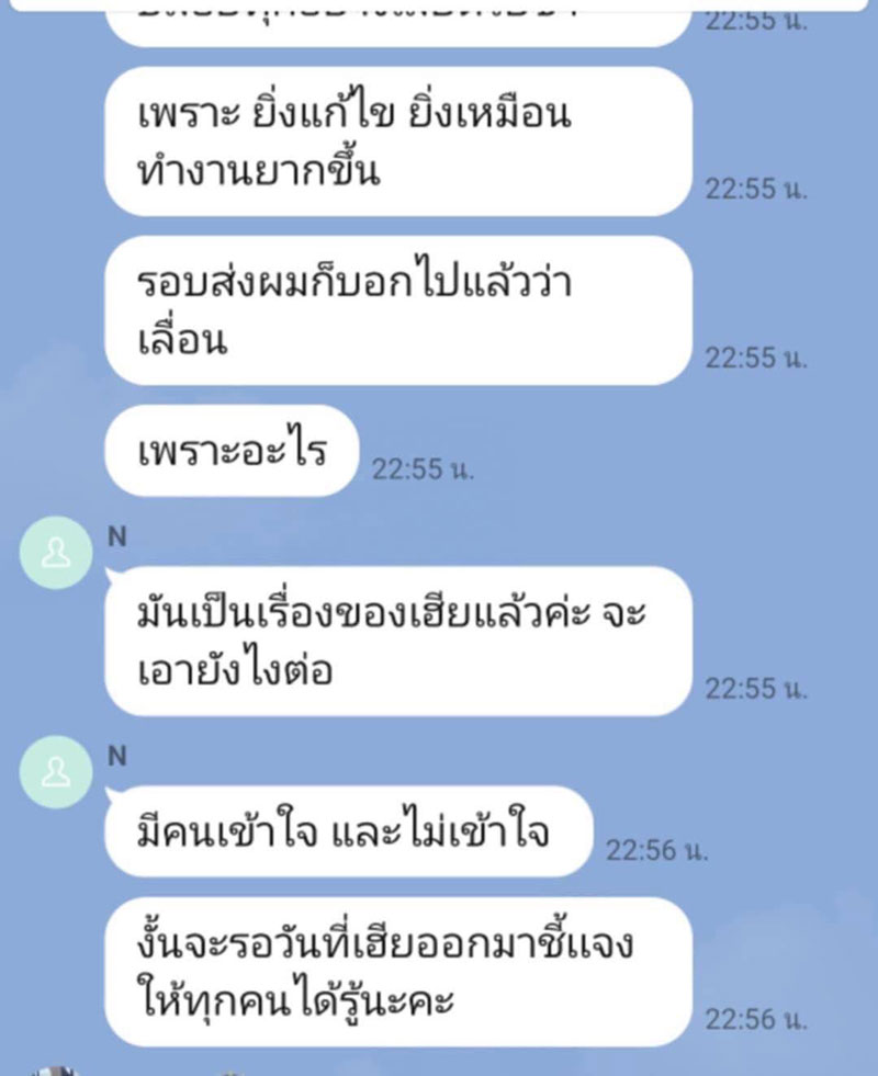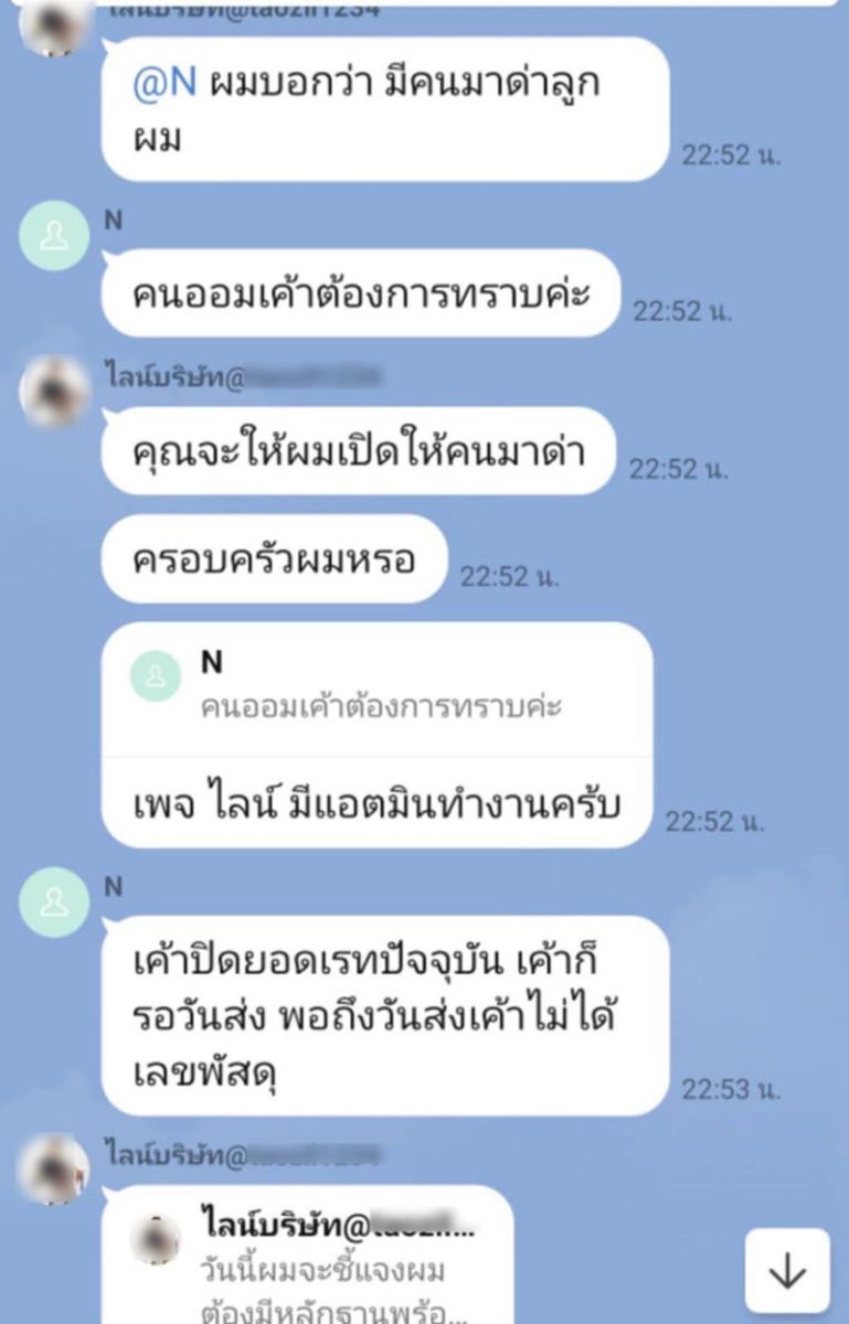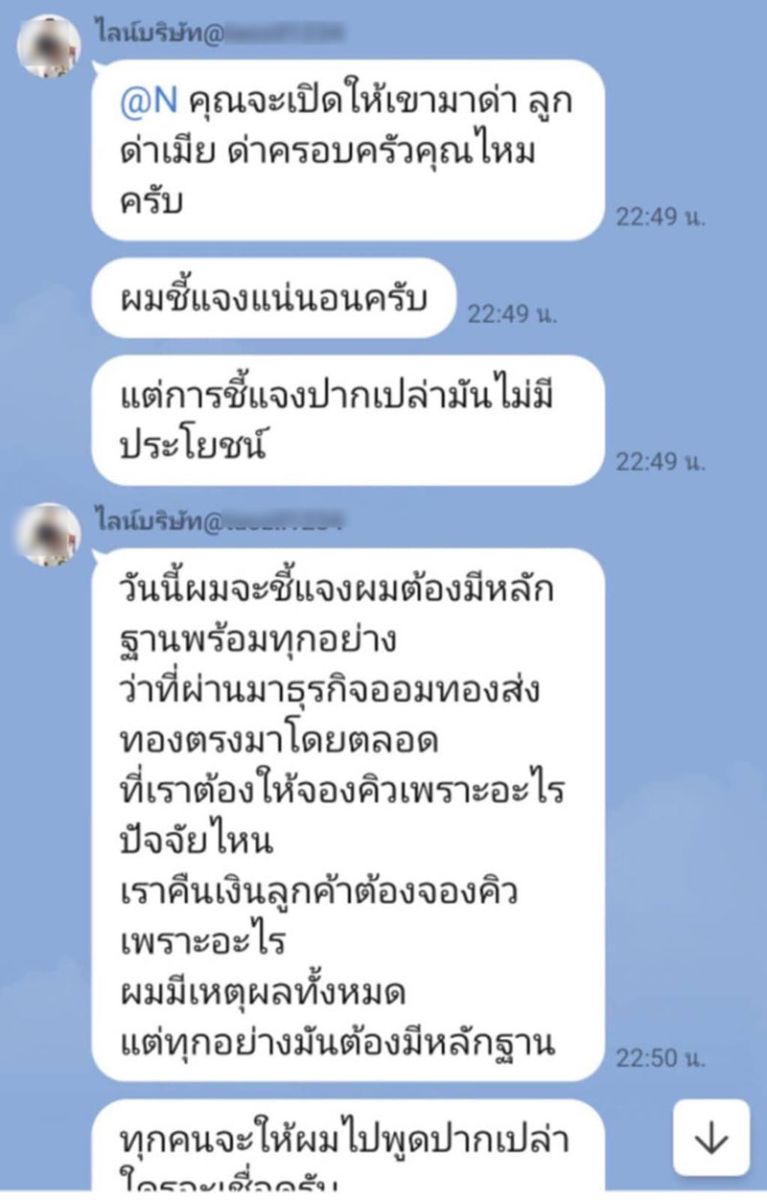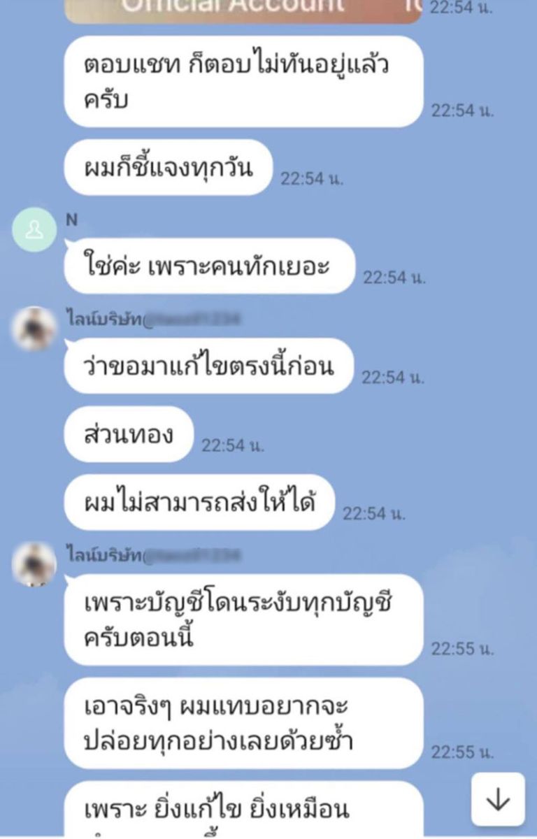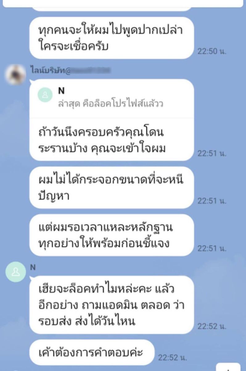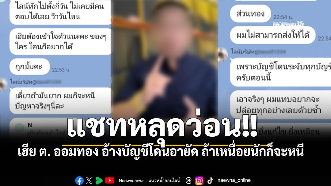 ขณะที่เพจ "ซ้อเปา - เรื่องนี้ต้องใส่ใจ" ยังเผยแชทที่ระบุว่า " จาก "เฮียต. ออมทอง" ถึงคุณลูกค้า... โดยเฮีย ต. ยังระบุว่า "...รอเวลาหลักฐานทุกอย่างให้พร้อมก่อนชี้แจง ส่วนทอง ไม่สามารถส่งให้ได้ เพราะบัญชีโดนระงับทุกบัญชี เอาจริงๆ ผมแทบอยากจะปล่อยทุกอย่างเลย เพราะยิ่งแก้ไขยิ่งเหมือนทำงานยากขึ้น เดี๋ยวถ้ามันยาก ผมก็จะหนีปัญหาจริงๆ...."