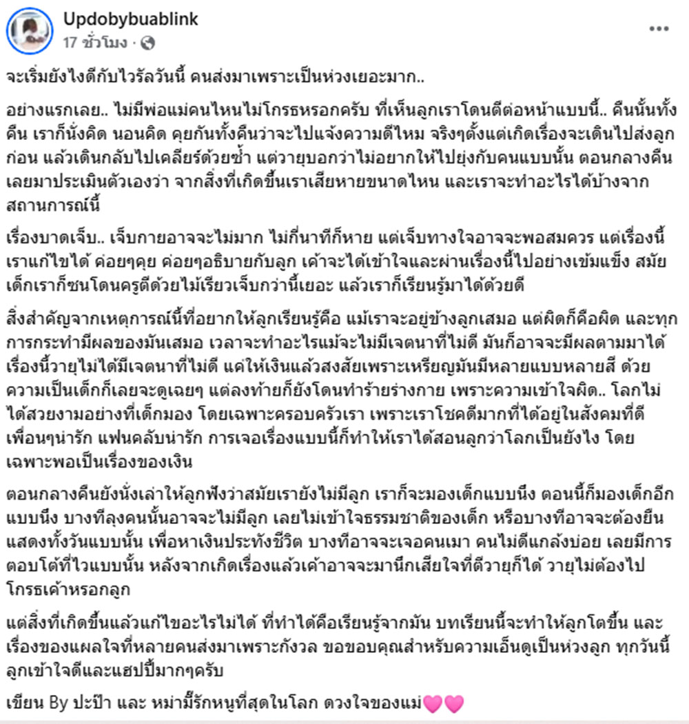 ล่าสุด บัว สโรชา ได้ออกมาโพสต์ร่ายยาวผ่านทางเฟซบุ๊กส่วนตัว "Updobybuablink" ระบุว่า จะเริ่มยังไงดีกับไวรัลวันนี้ คนส่งมาเพราะเป็นห่วงเยอะมาก..