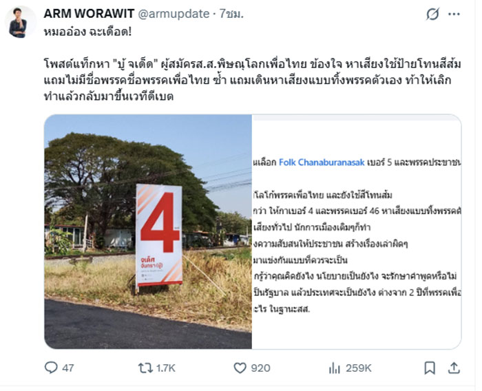 เมื่อวันที่ 28 มกราคม 2569 อาร์ม วรวิช นักเขียน นักข่าว และนักวิเคราะห์ด้านการเมือง สังคม และวัฒนธรรมไทย ได้ทวีตข้อความผ่าน X (ARM WORAWIT @armupdate) ระบุว่า "หมออ๋อง ฉะเดือด! โพสต์แท็กหา "บู้ จเด็ด" ผู้สมัคร สส.พิษณุโลก เพื่อไทย ข้องใจ หาเสียงใช้ป้ายโทนสีส้ม แถมไม่มีชื่อพรรคชื่อพรรคเพื่อไทย ซ้ำ แถมเดินหาเสียงแบบทิ้งพรรคตัวเอง ท้าให้เลิกทำแล้วกลับมาขึ้นเวทีดีเบต"
