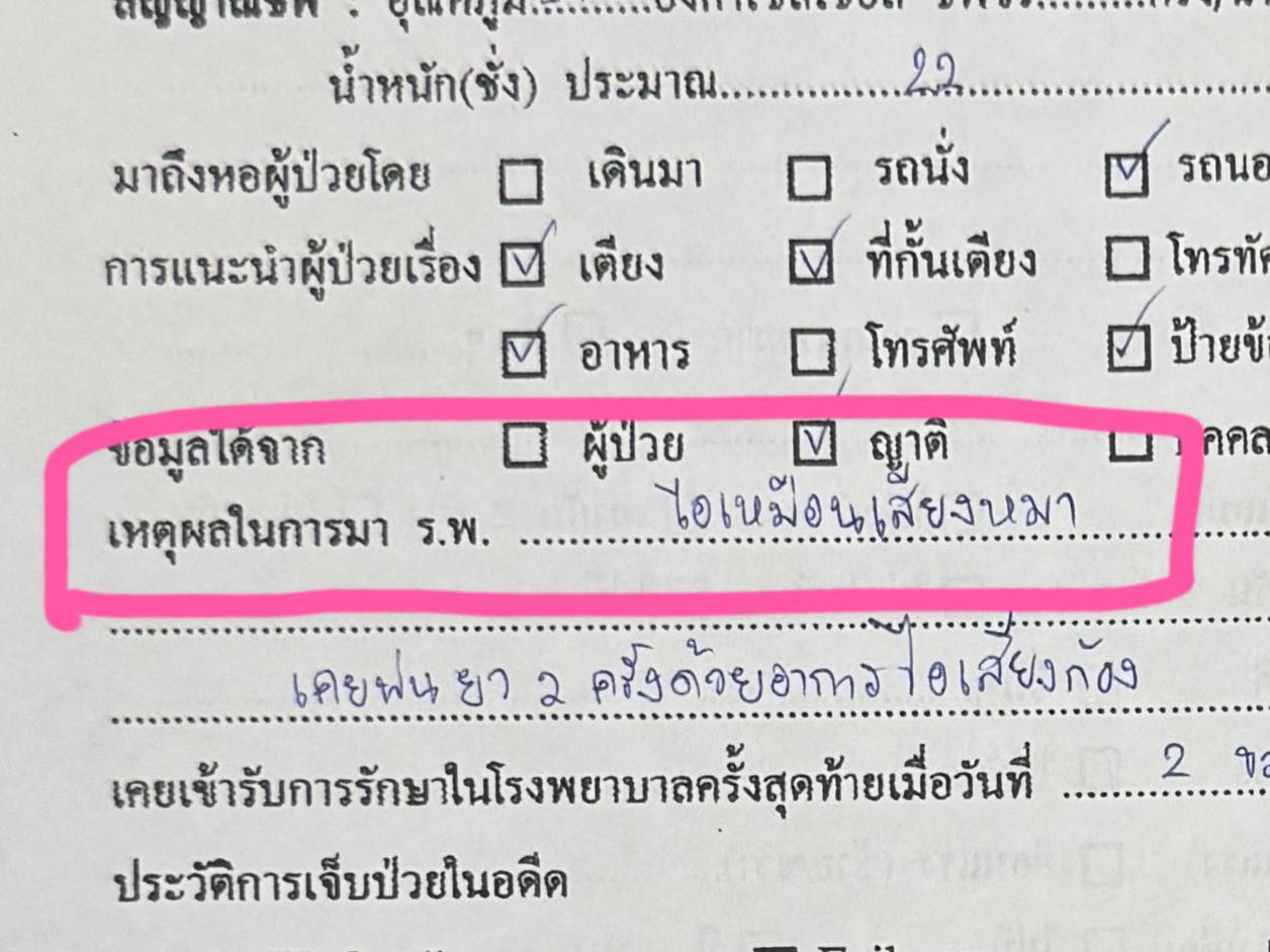 กลายเป็นสีสันบนโลกโซเชียลที่ทำเอาชาวเน็ตกลั้นขำไม่อยู่ เมื่อผู้ใช้เฟซบุ๊กชื่อคุณ "ณิชา ณัฐณิชาช์" ได้โพสต์ภาพใบนำทางหน้าห้องตรวจของโรงพยาบาลแห่งหนึ่ง ซึ่งจุดที่สะดุดตาที่สุดไม่ใช่ชื่อคนไข้ แต่เป็นช่อง "เหตุผลที่มาโรงพยาบาล" ในช่องระบุอาการป่วย แทนที่จะเขียนว่า "ไอแห้ง" หรือ "มีเสมหะ" ตามปกติ คนไข้กลับระบุอาการแบบ Real สุดๆ ว่า "ไอเสียงเหมือนหมา"