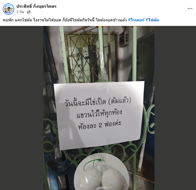 โดยเจ้าของเฟซบุ๊กดังกล่าว ได้ระบุข้อความไว้ว่า " หอพัก แจกไข่ต้ม วิ่งงานไม่ได้ยอด ก็ยังมีไข่ต้มกินวันนี้ ไม่ต้องอดข้าวแล้ว #ไรเดอร์ #ไข่ต้ม "