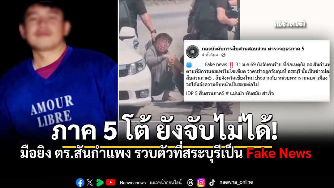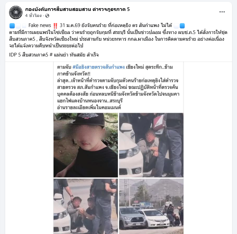 โดย ระบุว่า Fake news 31 ม.ค.69 ยังจับคนร้าย ที่ก่อเหตุยิง ตร สันกำแพง ไม่ได้ ตามที่มีการเผยแพร่ในโซเชียล ว่าคนร้ายถูกจับกุมที่ สระบุรี นั้นเป็นข่าวปลอม ซึ่งทาง ผบช.ภ.5 ได้สั่งการให้ชุดสืบสวนภาค5 , สืบจังหวัดเชียงใหม่ ประสานกับ หน่วยทหาร กกล.ผาเมือง ในการติดตามคนร้าย อย่างต่อเนื่อง จะได้แจ้งความคืบหน้าเป็นระยะต่อไป