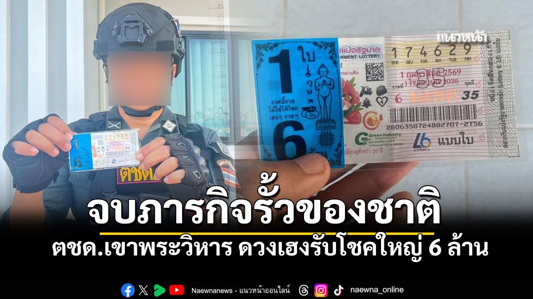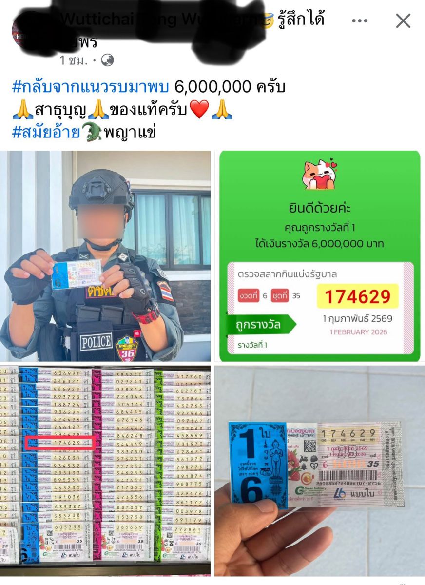 เมื่อวันที่ 1 กุมภาพันธ์ 2569 เพจเฟซบุ๊กชื่อดัง “วิถี ตชด.” ได้โพสต์เรื่องราวสุดประทับใจของเจ้าหน้าที่ตำรวจตระเวนชายแดนนายหนึ่ง ซึ่งปฏิบัติหน้าที่อยู่บริเวณพื้นที่เขาพระวิหาร จังหวัดศรีสะเกษ โดยเจ้าหน้าที่นายดังกล่าวถูกสลากกินแบ่งรัฐบาล รางวัลที่ 1 หมายเลข 174629 จำนวน 1 ใบ รับเงินรางวัลมูลค่า 6,000,000 บาท