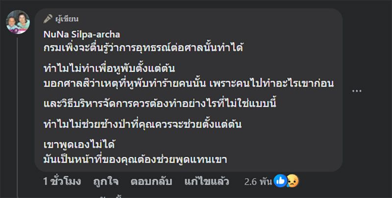 กรมเพิ่งจะตื่นรู้ว่าการอุทธรณ์ต่อศาลนั้นทำได้ ทำไมไม่ทำเพื่อหูพับตั้งแต่ต้น บอกศาลสิว่าเหตุที่หูพับทำร้ายคนนั้น เพราะคนไปทำอะไรเขาก่อน และวิธีบริหารจัดการควรต้องทำอย่างไรที่ไม่ใช่แบบนี้ ทำไมไม่ช่วยช้างป่าที่คุณควรจะช่วยตั้งแต่ต้น เขาพูดเองไม่ได้ มันเป็นหน้าที่ของคุณต้องช่วยพูดแทนเขา