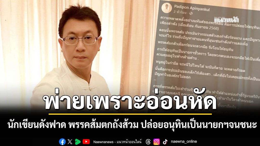 9 กุมภาพันธ์ 2569 นายปฏิพล อภิญญาณกุล นักเขียนชื่อดัง โพสต์ข้อความผ่านเฟซบุ๊ก Padipon Apinyankul แสดงความคิดเห็นทางการเมือง วิเคราะห์ความพ่ายแพ้ของพรรคประชาชน ภายหลังผลการเลือกตั้ง ระบุว่า