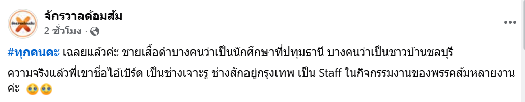 #ทุกคนคะ เฉลยแล้วค่ะ ชายเสื้อดำบางคนว่าเป็นนักศึกษาที่ปทุมธานี บางคนว่าเป็นชาวบ้านชลบุรี ความจริงแล้วพี่เขาชื่อไอ้เบิร์ด..." ข้อความจากโพสต์ต้นทางระบุ