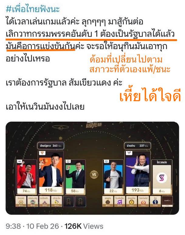 ที่น่าทึ่งสุดๆคือด้อมพรรคเดียวกับที่เคยตะโกนว่า “ทำไมพรรคที่ชนะที่ 1 ไม่ได้เป็นนายก” กลับเลียน้ำลายตัวเองที่ถ่มถุยออกไปแล้วกลับคำ มาเป็น “อย่ายอมให้พรรคชนะที่ 1 ได้เป็นร้าบาน เพราะมันคือการแข่งขันจ้า ต้องแย่งมา”