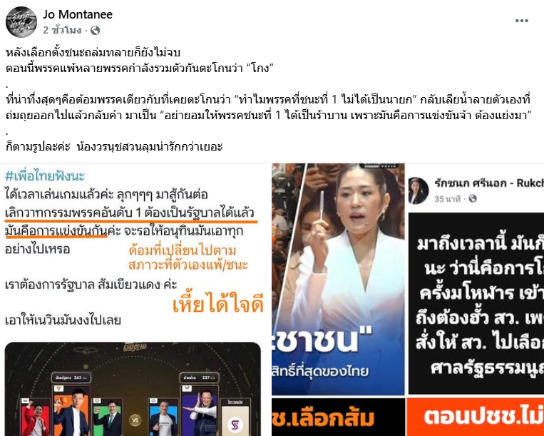 โจ มณฑานี อดีตดีเจและนักเขียนชื่อดัง โพสต์ภาพและข้อความผ่านเฟซบุ๊ก Jo Montanee โดยระบุข้อความว่า " หลังเลือกตั้งชนะถล่มทลายก็ยังไม่จบ ตอนนี้พรรคแพ้หลายพรรคกำลังรวมตัวกันตะโกนว่า “โกง”