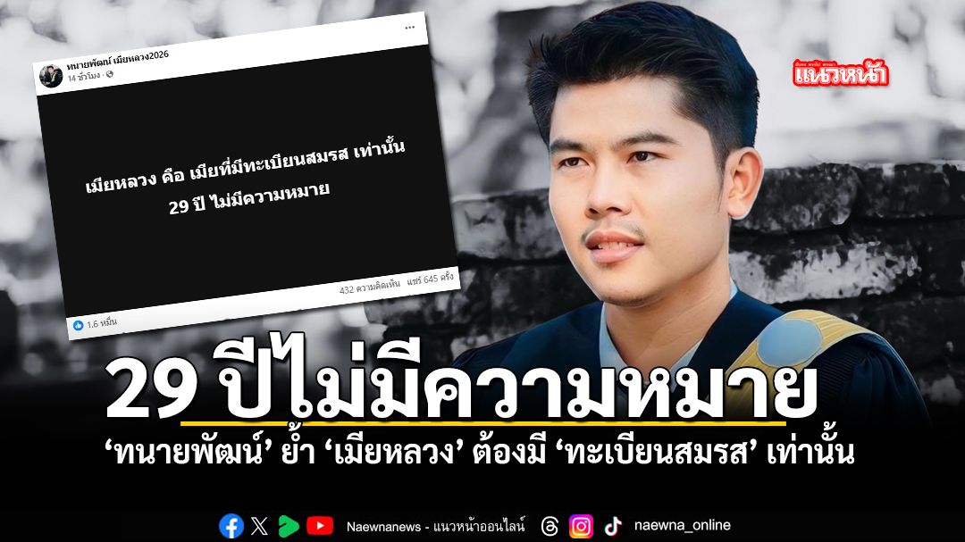 ทางด้าน ทนายพัฒน์ เมียหลวง2026 ทนายความชื่อดังที่ยืนหนึ่งข้างเมียหลวงมาตลอด ได้ออกมาเคลื่อนไหวผ่านเฟซบุ๊กเมื่อวันที่ 10 กุมภาพันธ์ 2569 ระบุข้อความสั้น ๆ แต่จุกอกว่า "เมียหลวง คือ เมียที่มีทะเบียนสมรส เท่านั้น 29 ปี ไม่มีความหมาย"