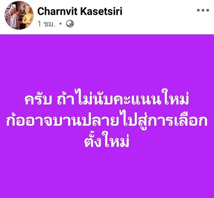 11 กุมภาพันธ์ 2569 ศ.พิเศษ ดร.ชาญวิทย์ เกษตรศิริ อดีตอธิการบดีมหาวิทยาลัยธรรมศาสตร์ และอดีตสมาชิกพรรคอนาคตใหม่ (อนค.) โพสต์ข้อความผ่านเฟซบุ๊ก Charnvit Kasetsiri ระบุว่า "ครับ ถ้าไม่นับคะแนนใหม่ ก้ออาจบานปลายไปสู่การเลือกตั้งใหม่"