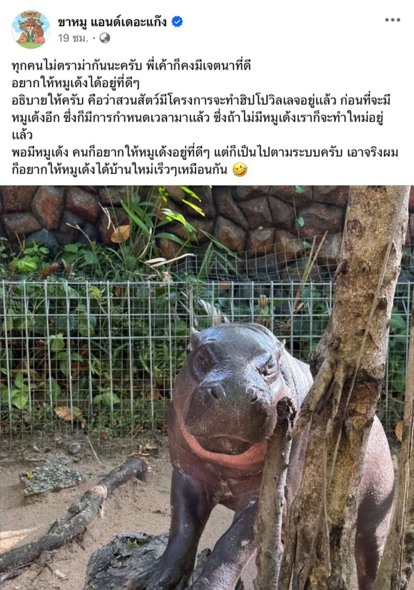 อธิบายให้ครับ คือว่า สวนสัตว์มีโครงการจะทำฮิปโปวิลเลจอยู่เเล้ว ก่อนที่จะมีหมูเด้งอีก ซึ่งก็มีการกำหนดเวลามาเเล้ว ซึ่งถ้าไม่มีหมูเด้งเราก็จะทำใหม่อยู่เเล้ว พอมีหมูเด้ง คนก็อยากให้หมูเด้งอยู่ที่ดีๆ แต่ก็เป็นไปตามระบบครับ เอาจริงผมก็อยากให้หมูเด้งได้บ้านใหม่เร็วๆเหมือนกัน"
