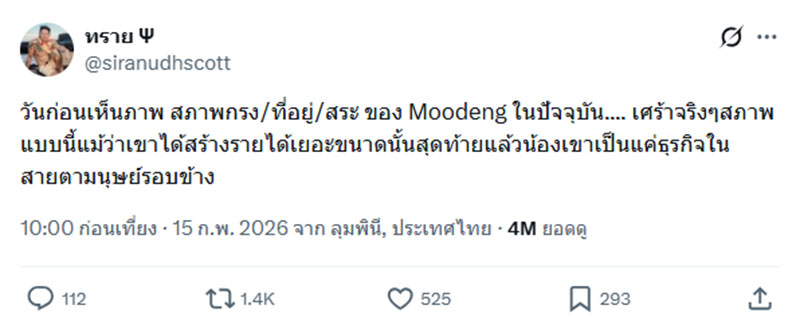 16 กุมภาพันธ์ 2569 กลายเป็นประเด็นดรามาสนั่นโซเชียลเมื่อ นักอนุรักษ์ทางทะเลคนดัง ทราย สก๊อต หรือ ทราย สิรณัฐ สก๊อต ได้ออกมาโพสต์ข้อความตั้งคำถามผ่านทางเอ็กซ์ (X) ส่วนตัว "@siranudhscott" ระบุข้อความว่า "วันก่อนเห็นภาพ สภาพกรง/ที่อยู่/สระ ของ Moodeng (หมูเด้ง) ในปัจจุบัน.... เศร้าจริงๆ สภาพแบบนี้แม้ว่าเขาได้สร้างรายได้เยอะขนาดนั้นสุดท้ายแล้วน้องเขาเป็นแค่ธุรกิจในสายตามนุษย์รอบข้าง"