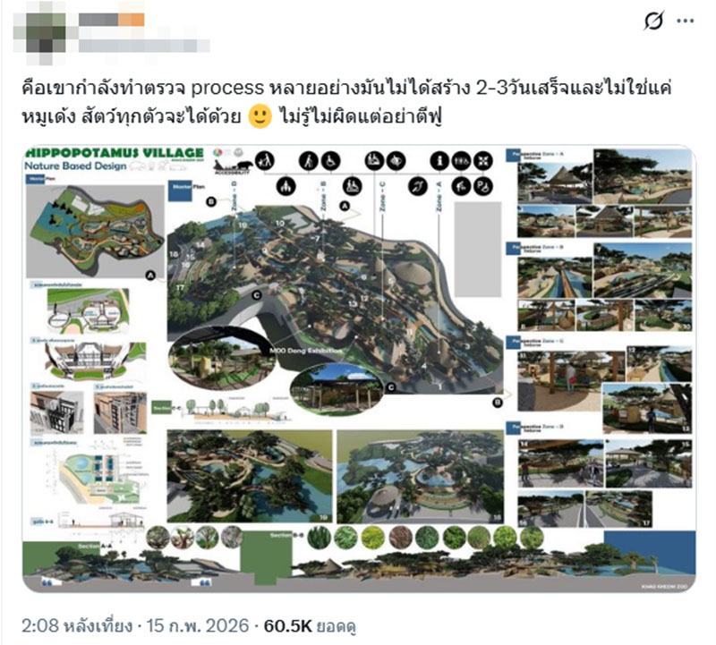 16 กุมภาพันธ์ 2569 จากกรณีที่ 'ทราย สก๊อต' นักอนุรักษ์ทางทะเลคนดัง ได้ออกมาโพสต์ตั้งคำถามผ่านทางแพลตฟอร์มเอ็กซ์ (X) ถึงสภาพที่อยู่ของฮิปโปแคระที่โด่งดังไปทั่วโลกอย่าง 'หมูเด้ง' ว่า "วันก่อนเห็นภาพ สภาพกรง/ที่อยู่/สระ ของ Moodeng (หมูเด้ง) ในปัจจุบัน.... เศร้าจริงๆ สภาพแบบนี้แม้ว่าเขาได้สร้างรายได้เยอะขนาดนั้นสุดท้ายแล้วน้องเขาเป็นแค่ธุรกิจในสายตามนุษย์รอบข้าง" ก่อนที่ 'ทราย สก๊อต' จะโดนทัวร์ลงหนัก