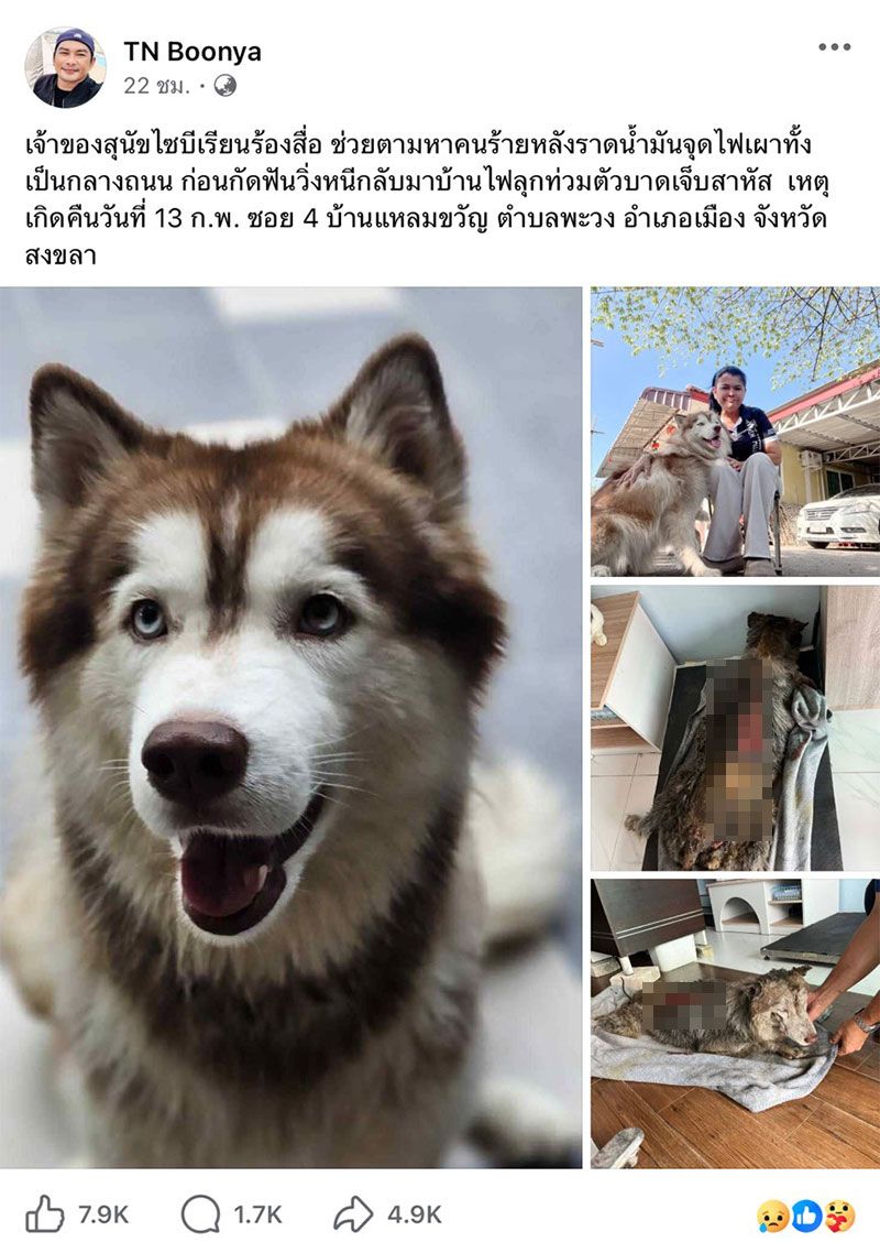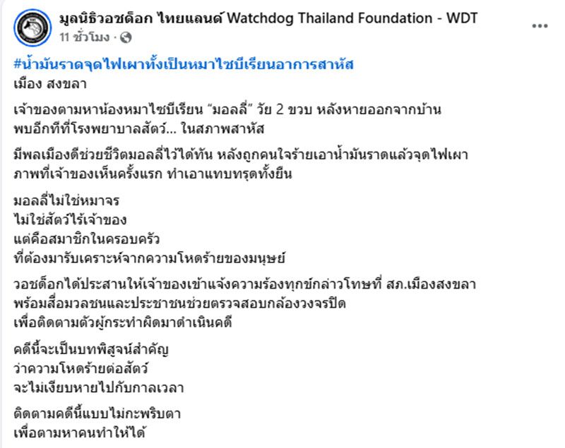ด้าน มูลนิธิวอซด็อกไทยแลนด์ ได้ออกมาโพสต์ข้อความว่า #น้ำมันราดจุดไฟเผาทั้งเป็นหมาไซบีเรียนอาการสาหัส เมืองสงขลา เจ้าของตามหาน้องหมาไซบีเรียน “มอลลี่” วัย 2 ขวบ หลังหายออกจากบ้านพบอีกทีที่โรงพยาบาลสัตว์… ในสภาพสาหัส